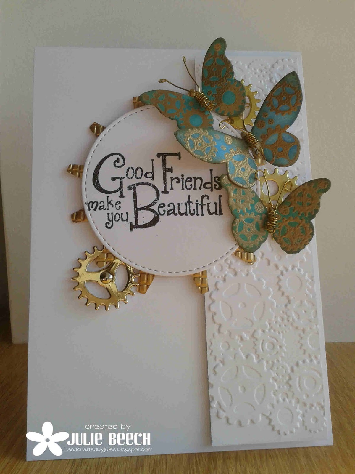 Anyway that's what being on a DT is all about, forcing yourself out of your comfort zone on occasions. As it is a stamped challenge I couldn't use a digi and I didn't have any stamps remotely related to the theme, except a few cog stamps that came free with a mag, so a little lateral thinking was involved!