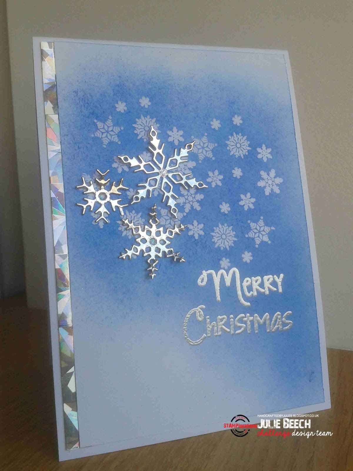 To start with I stamped the snowflakes from the Christmas Block stamp in clear EF on a white card panel, next I added the inky goodness and finally three die cut snowflakes with Stickles glitter in the centre. I added the sentiment from Christmas Candles in silver embossing and a strip of silver holographic card down the left hand side to complete.
