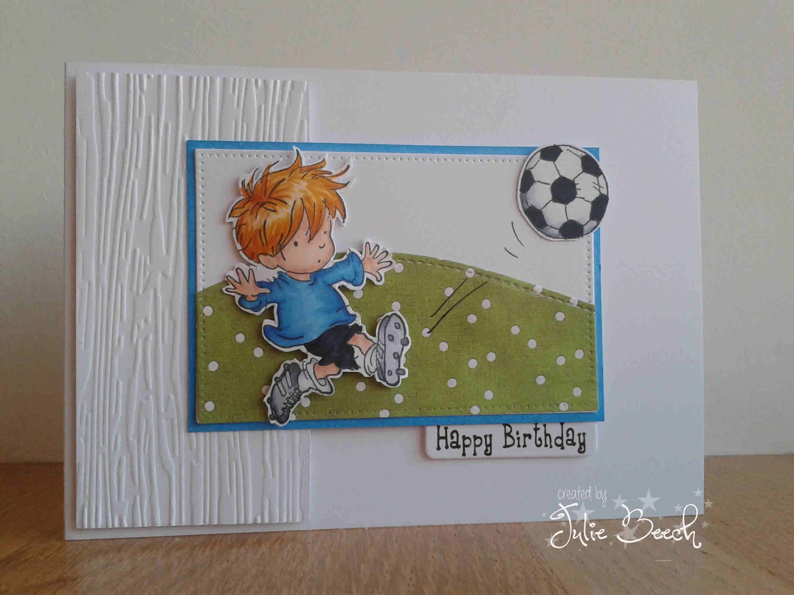 Jules this is so darned cute! I LOve that bit of embossed paper, and your footballer couldn't be cuter ... so wonderful - your grandson will love it!