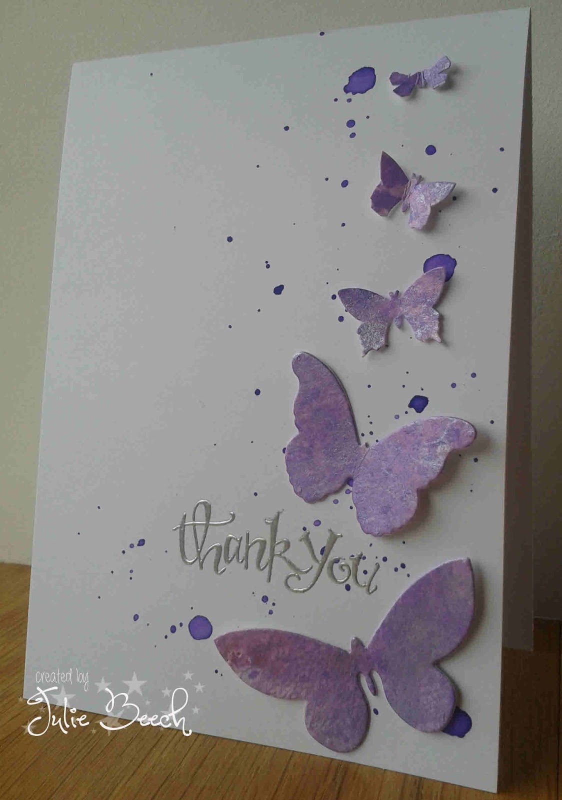 The butterflies were cut from a piece of MM paper that I smooshed with Violet Inka Gold wax and then some new Wilted Violet DI, I also added a few splashes of diluted DI over the base of my card. A 'thank you' sentiment from Stampin Up was stamped and embossed in silver.