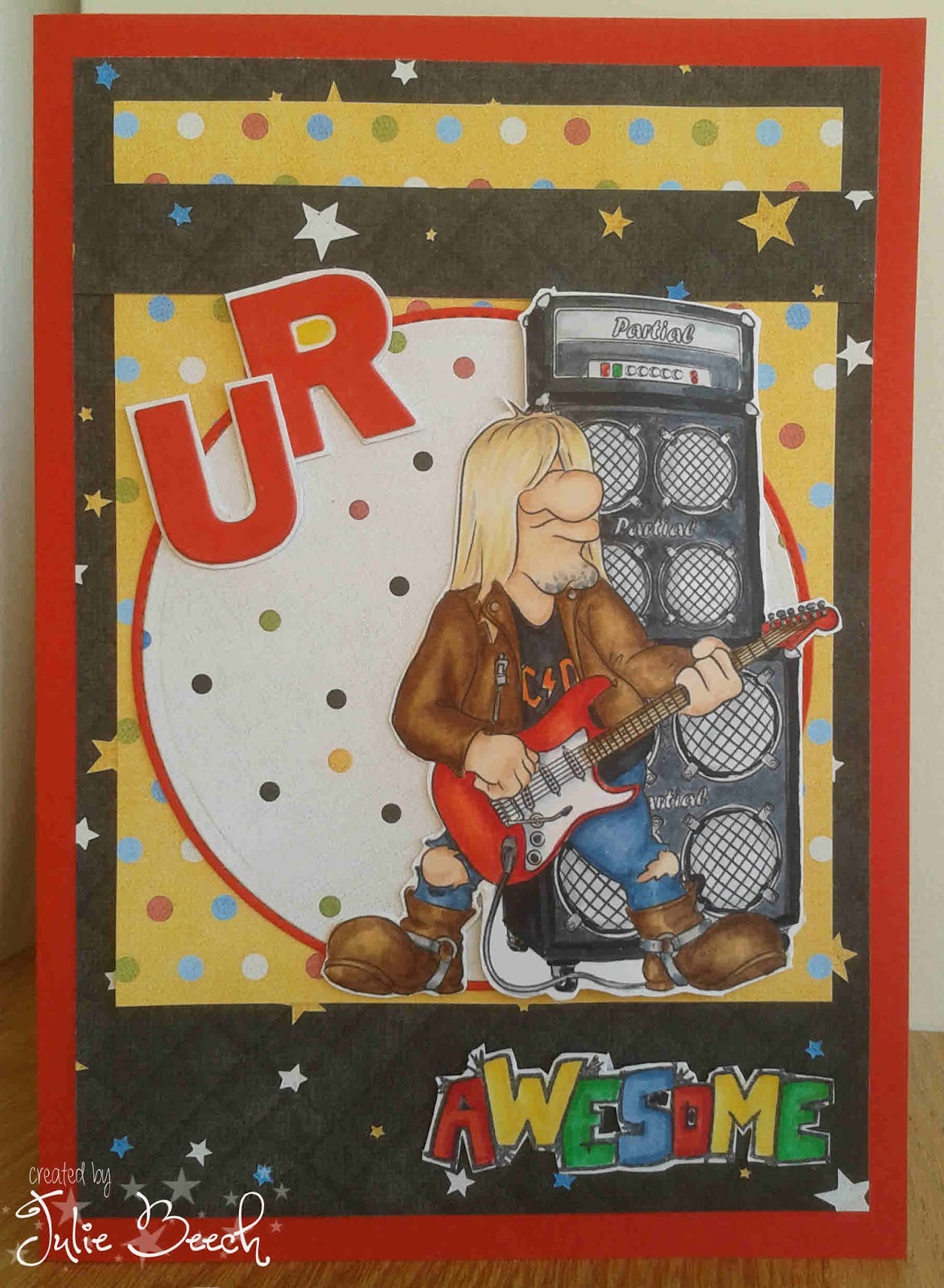 'Have an Amazing Birthday' from a STAMPloration's Party Time greetings set. The 'Awesome' greeting is stamped using part of a Woodware set and coloured to match the DPs. The U and R were cut using a MFT die and I added a white border to make them stand out.