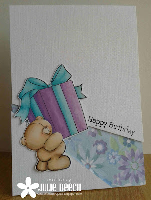 When I saw the theme I knew straight away which stamp I was going to use. It's from a Do Crafts set I picked up at The Range a couple of months back. There are some fab bear stamps in the set, I used another one here just after Christmas. I used a scrap of DP from NitWits that has been in the bits box for ages and picked out a couple of colours to use on the parcel. Typically I discovered that one of the Copics I used was running out and I'd only just sent of an order for some refils! Anyway I just about made it!