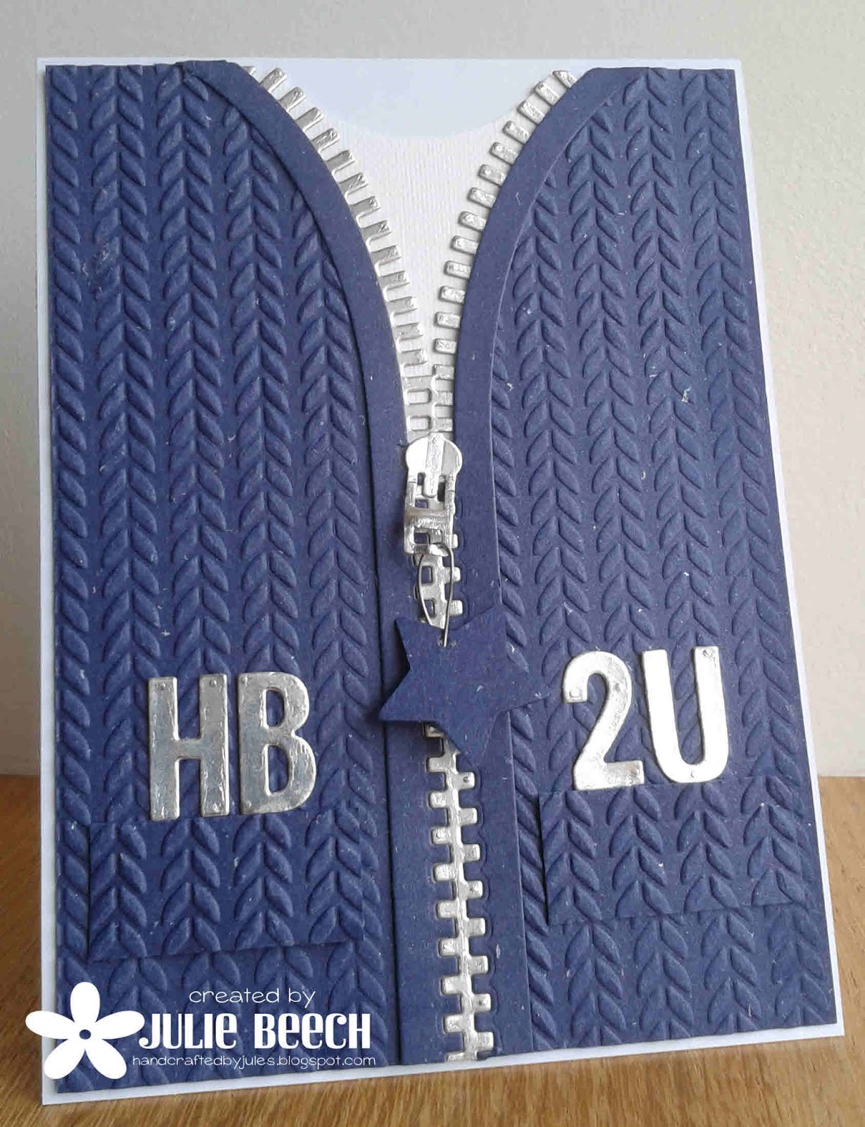 I cut the pieces from some flecked blue card, except for the zip and HB2U, which I cut from some ancient silver card in the scrap box. I ran the pockets and front panels through a Taylored Expressions Cable Knit embossing folder, then assembled the pieces. I had some linen textured card left over, so added a T shirt underneath which doesn't really show up on this photo. The toggle on the zip was a bit of a head scratcher as thread was not right then I remembered that Less is More would like to see wire on your CAS project so that was what I did, it did give a little weight to the star toggle so it hangs better.