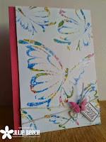 . After stamping through the Flutterby stencil from STAMPlorations, there was a lot of ink left on the stencil itself and the Yorkshire gal in me just couldn't wipe it off and waste it, so I spritzed the stencil with a little water then took a monoprint. The white space was a little unclear so to sharpen it up I replaced the now clean stencil and inked though with Versamark then embossed with white EP.