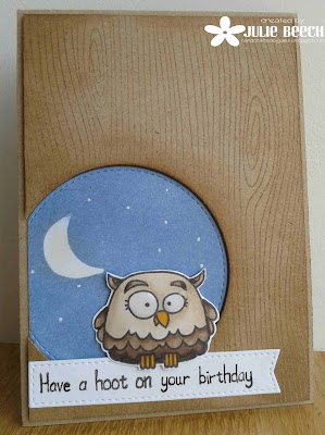 ReplyDeleteWoohoo back at you!! This is really lovely Julie, love them clear embossed woodgrain, you are so clever, and the little owl is a hoot!! xx