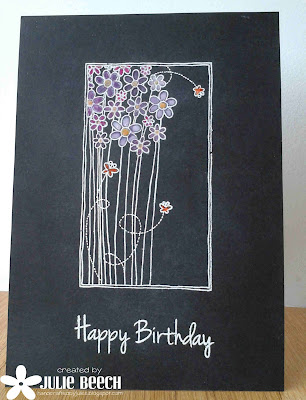 I decided to use a black base card and go one layer. The simplicity of the design makes the daisies the center of attention. The only problem is the colouring on the black card. I got around this by using a mixture of white crayon and white gouache paint, also known as body colour. The gouache gives a softer effect that the pencil as it is more opaque. The colour was from some DI s in fruity colours, after I had used some white EP on the stamped image. I added a HLS greeting to complete.