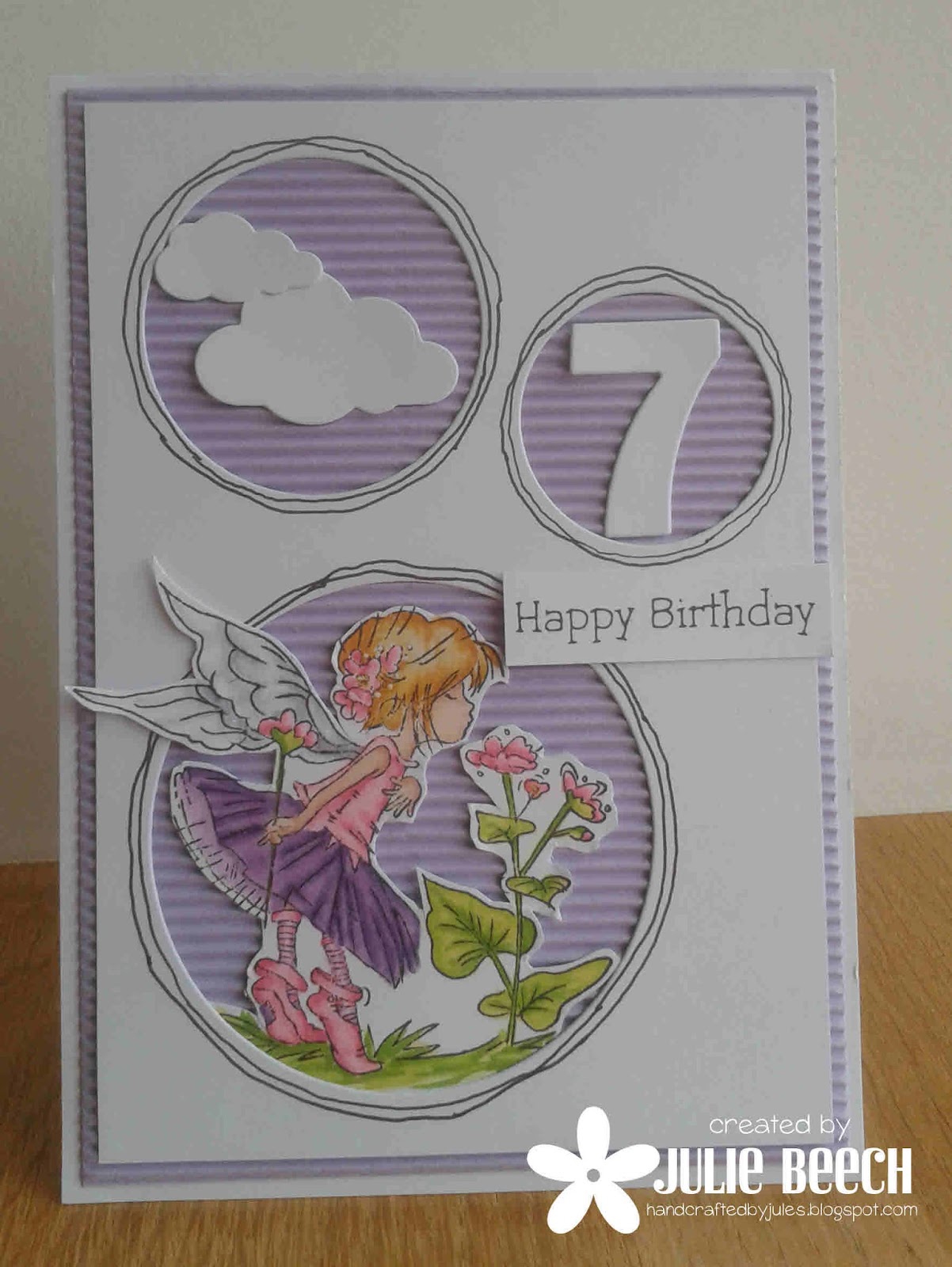 I cut some circles from my top panel then went in search of some DP from the stash to place under it so I could colour my fairy to match. I am honestly trying to use up my enormous pile of DP but in the end I used some corrugated lilac card. I coloured the fairy using Copics and then fussy cut her and popped her behind the largest circle, wings outside. I did add a little crystal Stickles to the wings but it was so fine it didn't show up in the photo! The clouds and 7 were die cut from some scraps of white card.