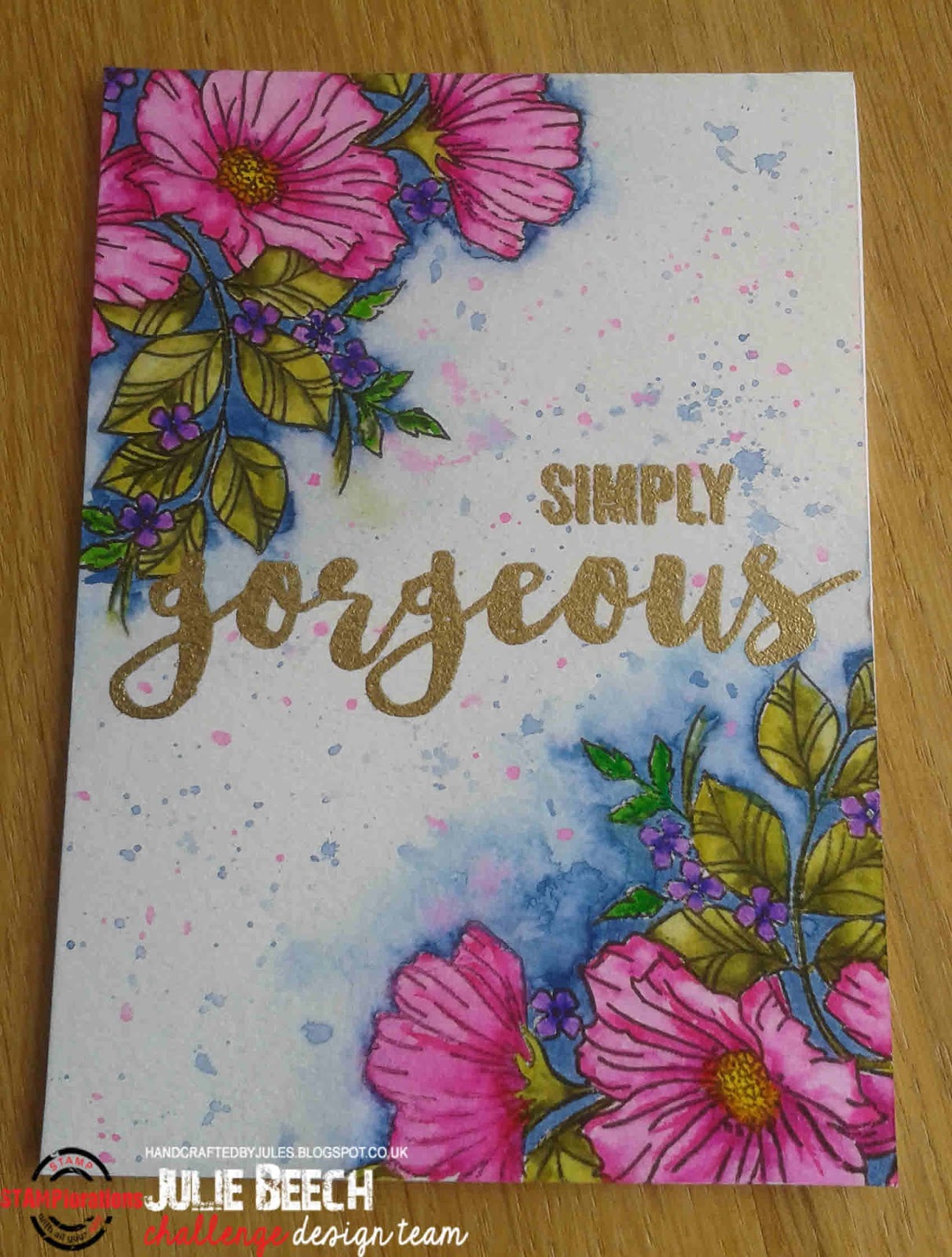 I stamped the spray twice in opposite corners of a MM paper panel with black Versafine ink before using my Zig pens to w/c the fab blooms. A little bit of splatter and a gold embossed greeting,I just had to use Bold Sentiments - Gorgeous, to complete. The panel was then glued flat onto a white base card.