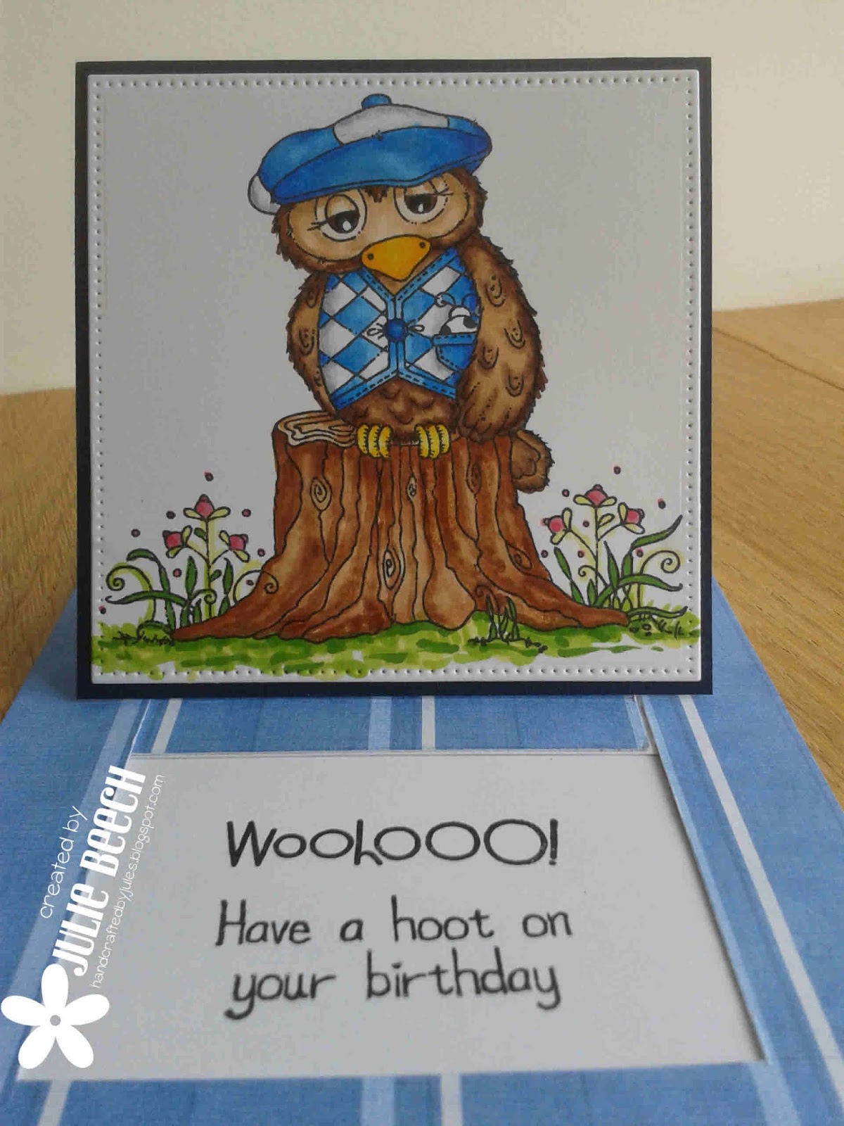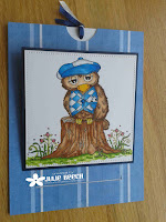 As regular readers may remember, I always try to incorporate an owl into Audrey's card, it's a long standing joke between us that started over 10 years ago. This latest image is courtesy of a brand new stamp from Daisy Mae stamps, by Clare Rowlands. She used to make the Molly Bloom ones and then went quiet for awhile before this new release.