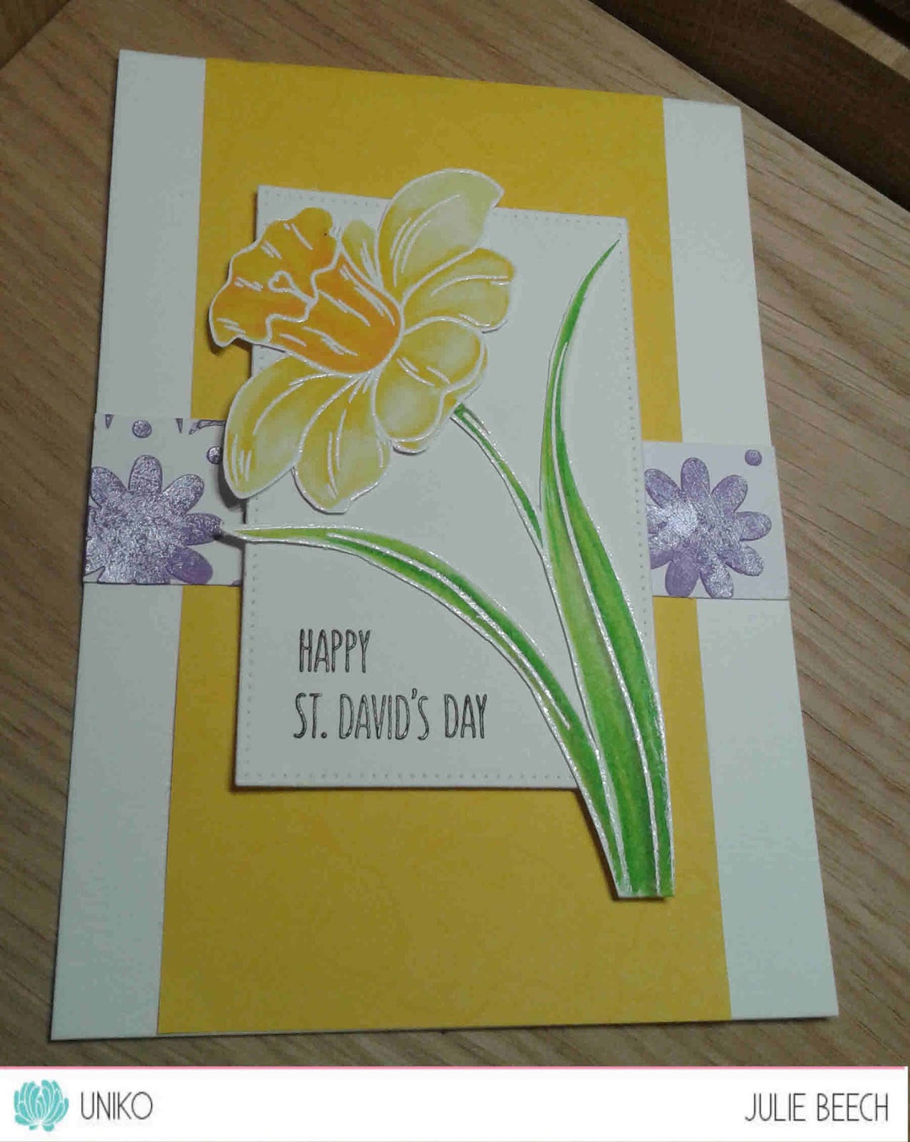 My sentiment from the same set was stamped in the bottom left corner with Memento Tuxedo Black then heat embossed with semi dull EP to give it a bit of definition. The dry daff was popped onto the sentiment panel and popped up on pads.